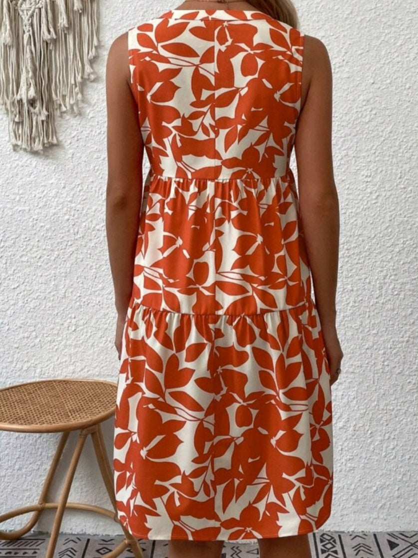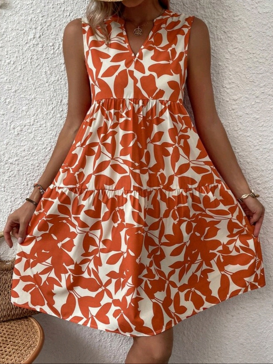 #4133 Allover Plant Print Notch Neck Ruffle Hem Dress