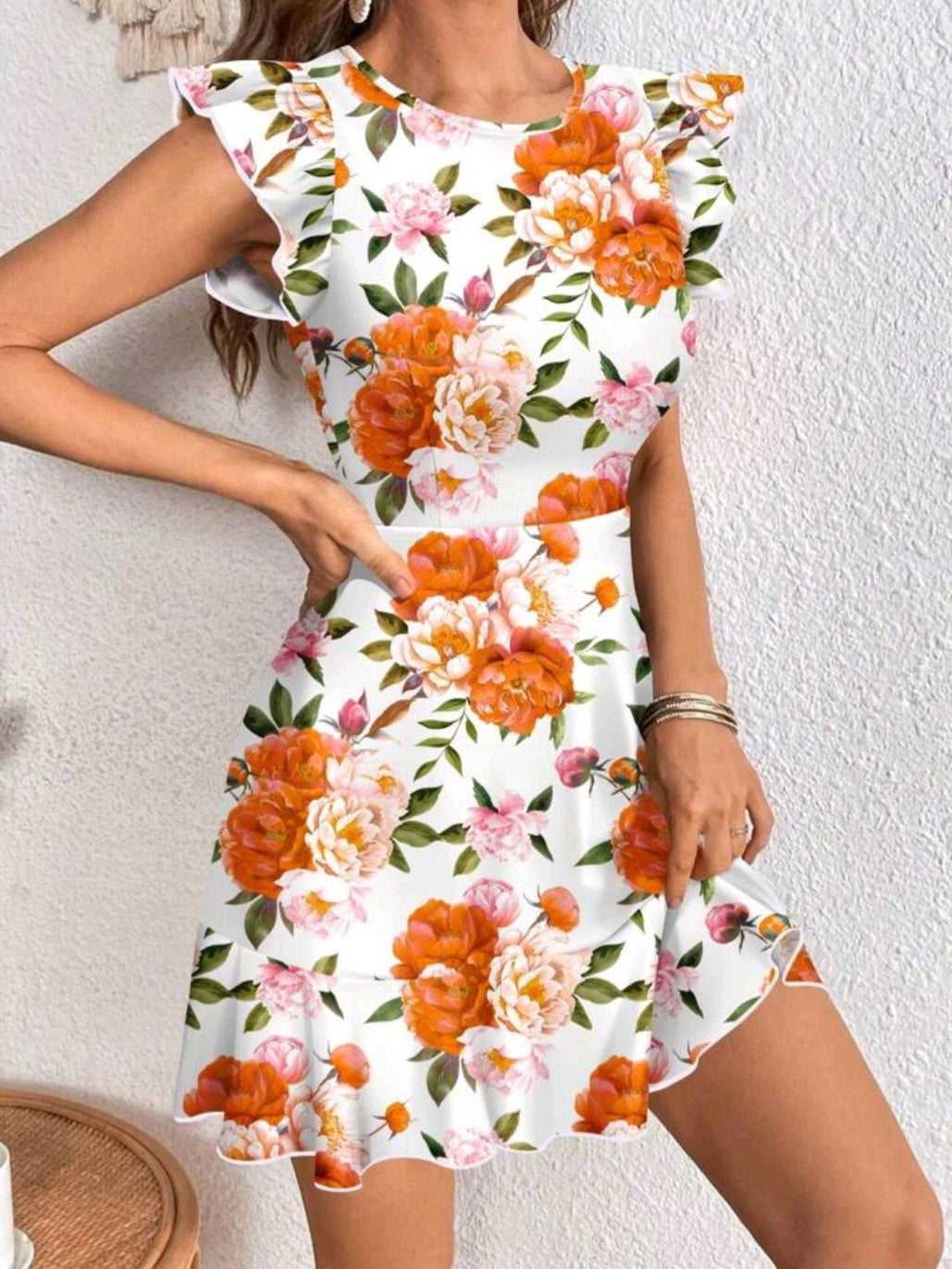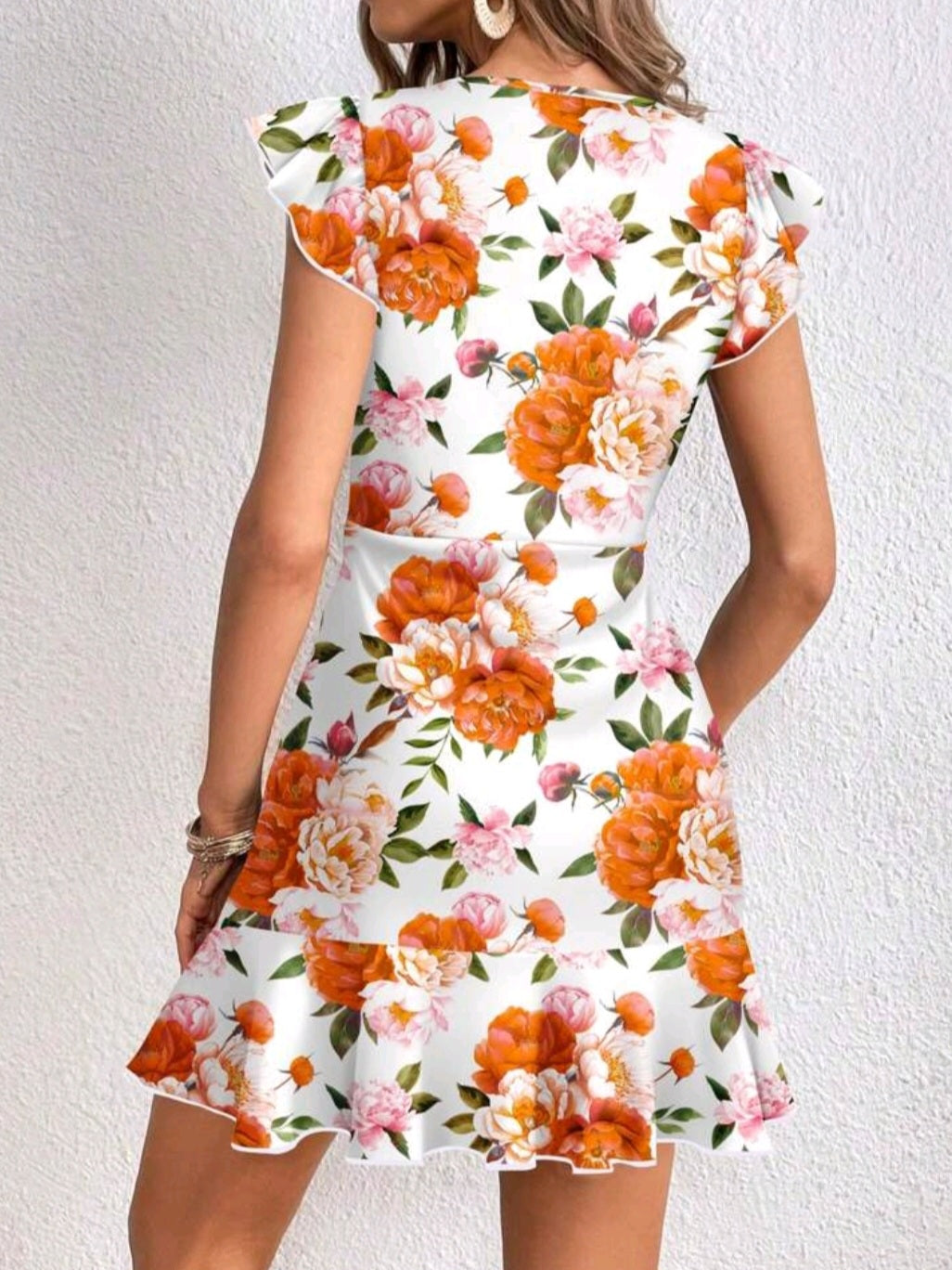 #3555 Floral Pattern Cap Sleeve Cinched Waist Dress