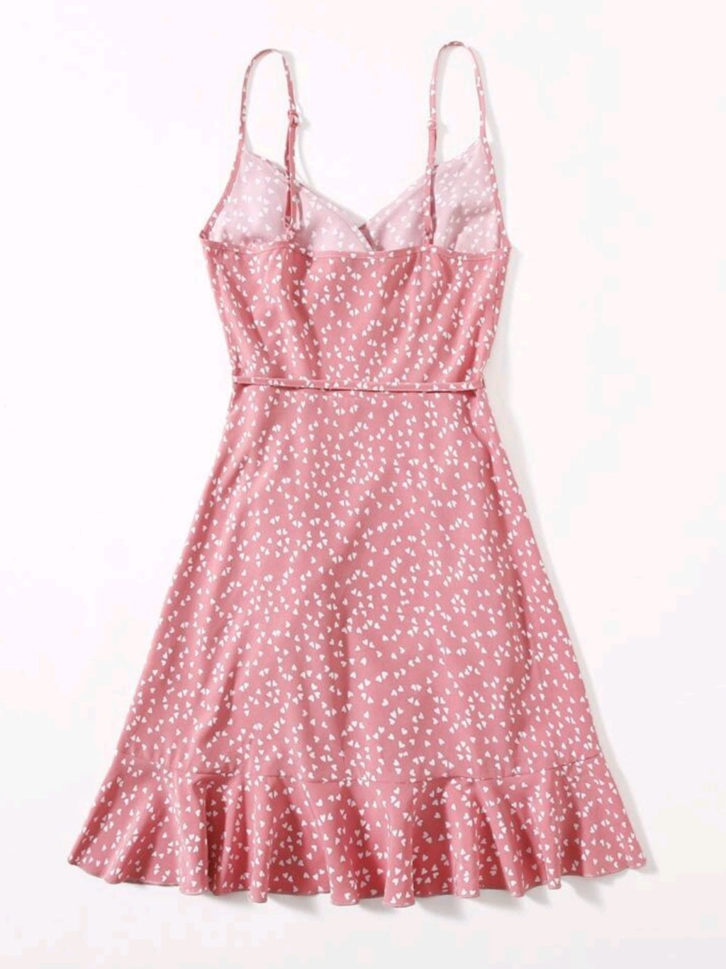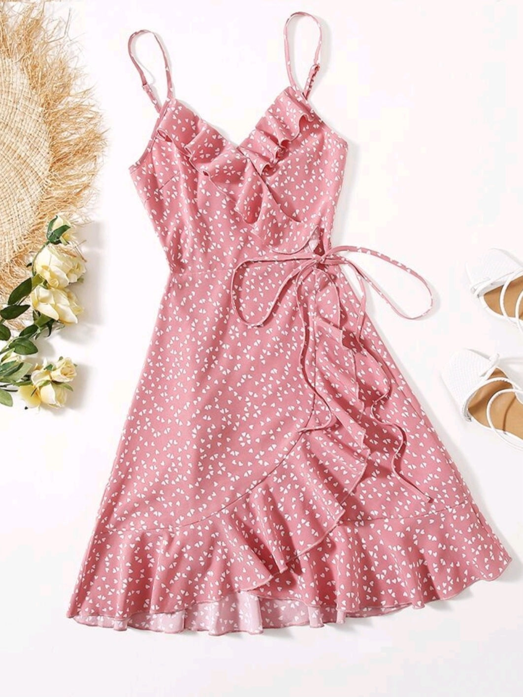 #2370 Heart Print Ruffle Detail Wrap Cami Dress