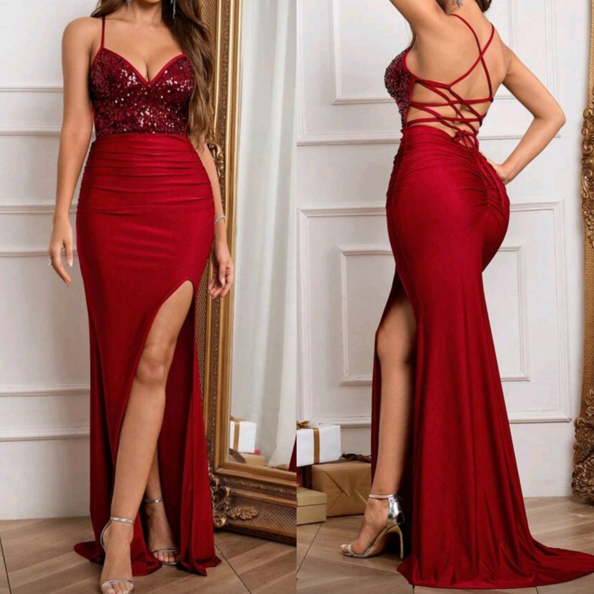 #7275 High Waisted Sequin Patchwork High Slit Dress Dresses