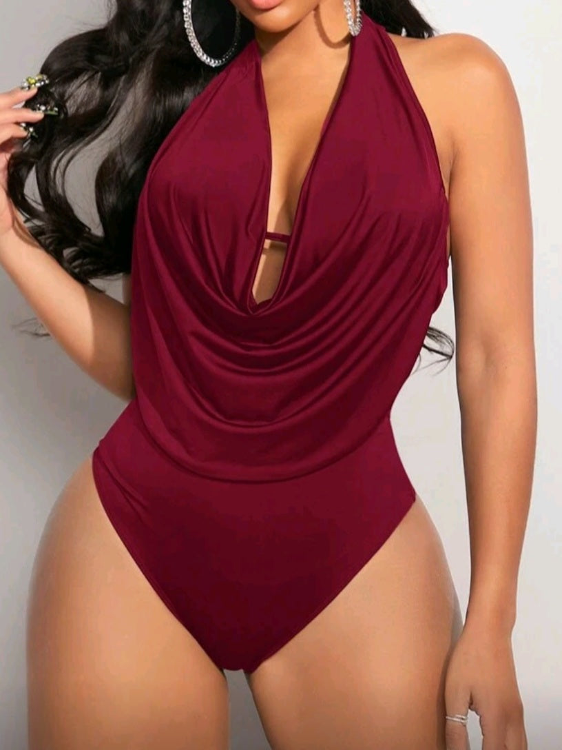 #6936 Solid Color Plunge Neckline Halter Bodysuit