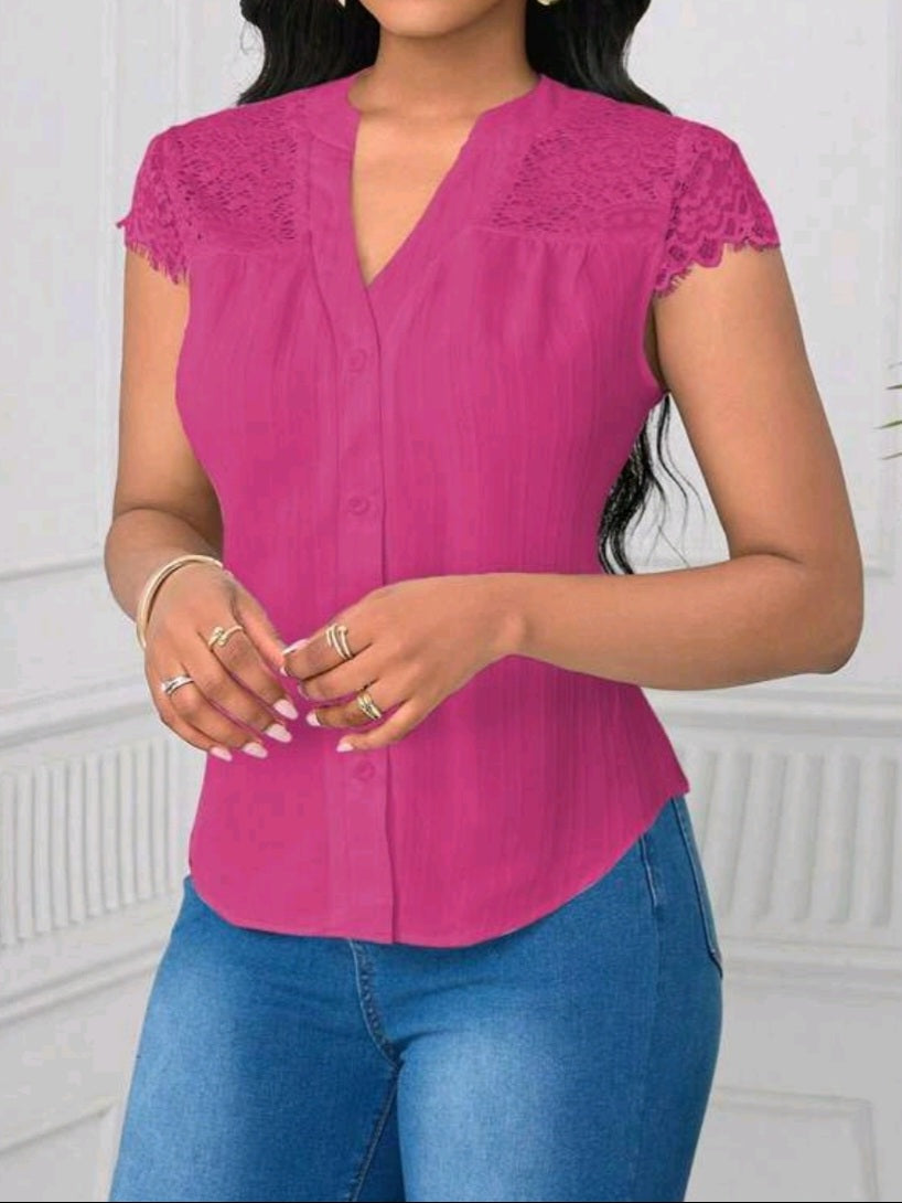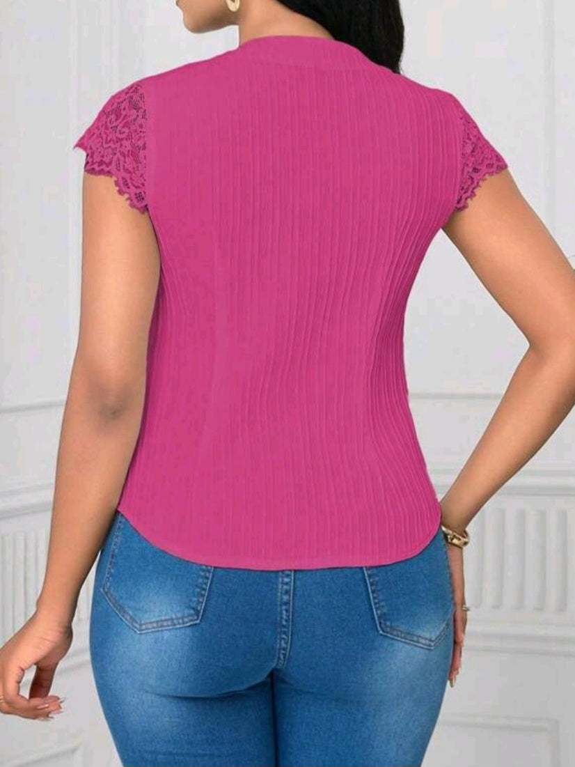 #1888 Elegant Lace Patchwork Wave Short Sleeve Blouse